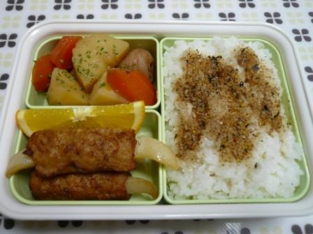 冷凍食品の肉巻きポテト、前日の夕飯ついでに一緒に火を通したジャガイモと人参の煮物(緑がないのでパセリふりふり)、梅干し、オレンジ(朝ごはんのあまり)、ふりかけご飯